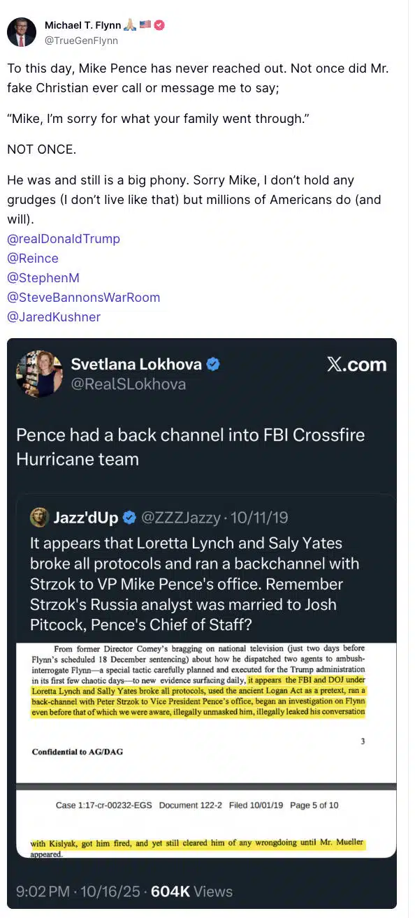 Author Svetlana Lokhova stated on X, based on a court filing by Michael Flynn’s lawyers, that Mike Pence had a back channel to the FBI Crossfire Hurricane team.
