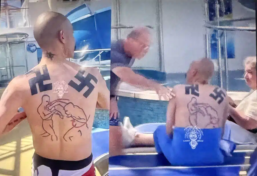 I don’t know who owns the video, so I don’t feel comfortable sharing it, but you can listen to the audio. The man with the swastikas on his back is on Norwegian Cruise Lines. One man, who is Jewish, reacted with anger, but he was alone. One young person filming thought it was funny, and the Jewish man was at fault for losing his temper.