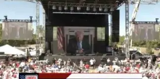 Donald Trump addresses a cheering crowd at a Mike Lindell rally...
