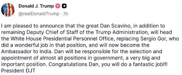“I am pleased to announce that the great Dan Scavino, in addition to remaining Deputy Chief of Staff of the Trump Administration, will head the White House Presidential Personnel Office, replacing Sergio Gor, who did a wonderful job in that position, and will now become the Ambassador to India,” Trump wrote on Truth Social.