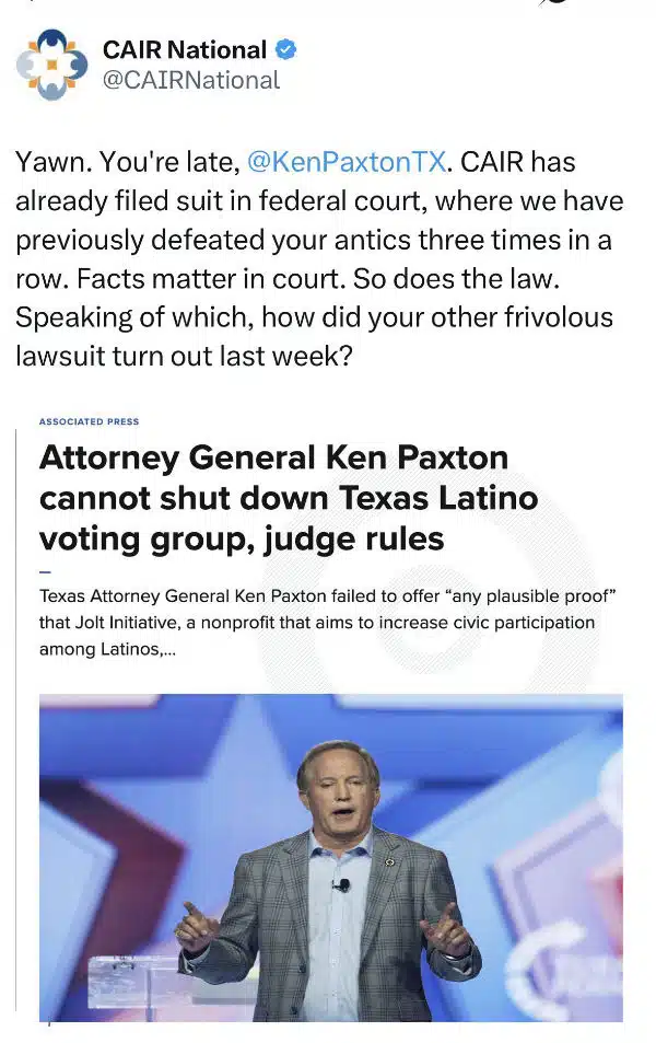 Texas Attorney General Ken Paxton sued CAIR and the Muslim Brotherhood in Texas, citing terrorist ties, Hamas funding links, and violent Sharia ideology spreading here. CAIR responded with mockery. Addressing Ken Paxton, they wrote back smugly, “Yawn, you’re late.”
