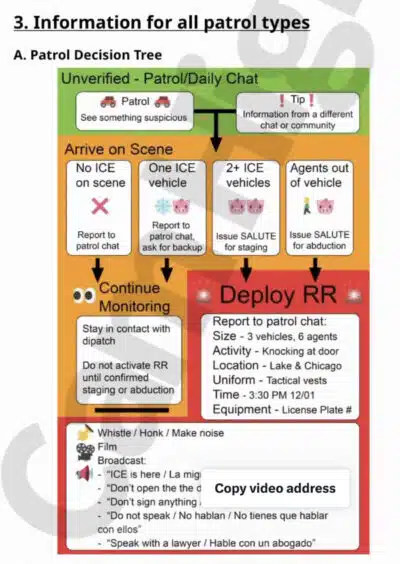 The manual claims they are neighbors protecting neighbors, and they’re not warriors. The manual describes various patrols and the plan to stalk ICE. It lists mobile patrols, stationary patrols, and foot patrols. The manual further instructs on how to block, report, and stalk, and what they should bring with them.