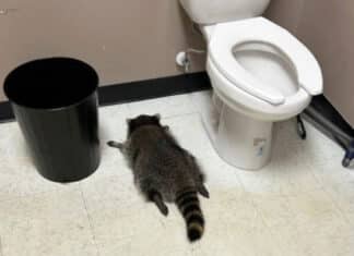 A raccoon was found splayed across the bathroom floor in a liquor store sleeping off a bender.