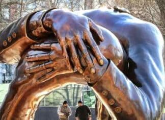 This sculpture, called The Embrace, is dubbed the Boston Statue of Liberty. It commemorates the love of Martin Luther King Jr. and Coretta Scott....