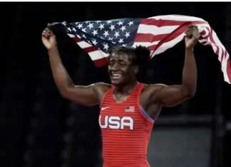 This terrific young woman is what we expect from our champions. She truly is that and she loves her country. Tamyra Mensah-Stock (USA) celebrates...