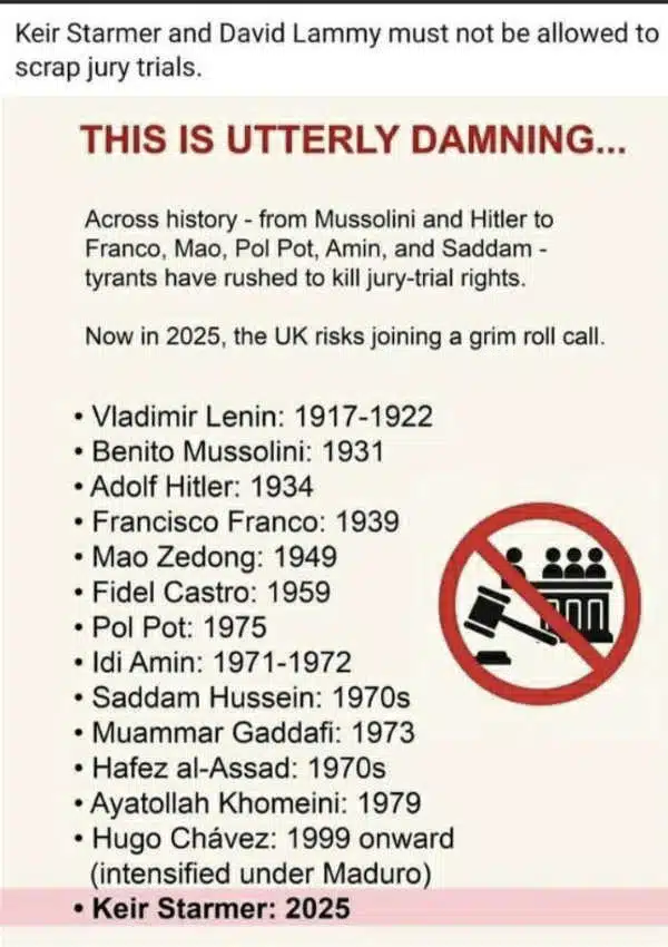 The radicals in charge of the UK are abandoning jury trials. Sir Keir Starmer, who needs that title taken away, and Chief Justice David Lammy, are relinquishing the right to a trial by a jury of one’s peers for most cases. This is very disturbing for a lot of reasons, partly because we are right behind the UK in establishing Stalinist policies. However, it’s also the fact that the British gave America so much that worked in our justice system and it is in shambles here in the US as well. We could see Democrats taking that right away, thanks to the same type of radical leftists. The Soros family is one good example.