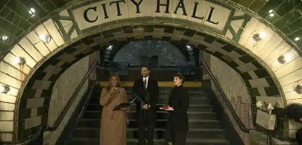 Four minutes before midnight, Mr. Mamdani, 34, his wife, Rama Duwaji, and Letitia James, the state attorney general, disembarked from a No. 6 train into the grimy, dimly lit, and yet stunning subway station. They promptly took their places on the steps beneath a dramatic archway emblazoned with the words, “City Hall.” And then they waited, a bit awkwardly, a bit jovially, for the arrival of the appointed hour.