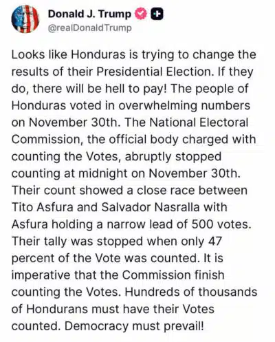 “Looks like Honduras is trying to change the results of their Presidential Election. If they do, there will be hell to pay! It is imperative that the Commission finish counting the Votes. Hundreds of thousands of Hondurans must have their Votes counted. Democracy must prevail!”