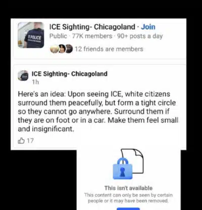 While a Facebook group for ICE sightings in Chicago does appear to have been taken down, as of Tuesday evening, dozens of other groups, some with thousands of members, remained visible on Facebook.