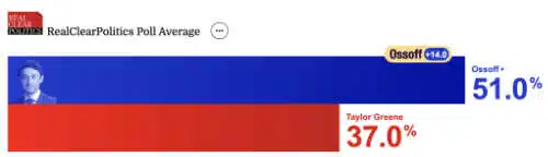 A Real Clear Politics poll came up with similar results. A state that would elect a Jon Ossoff won’t elect MTG. That is just common sense. Ossoff is way on the left, and MTG is seen as seen as a right-wing nut by people outside her district.