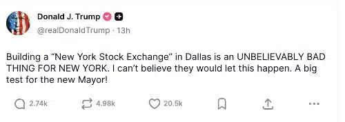 President Trump posted on Truth Social this morning that a New York Stock Exchange in Dallas “is an unbelievably bad thing for New York.” He added that he can’t believe they would allow them to do this.