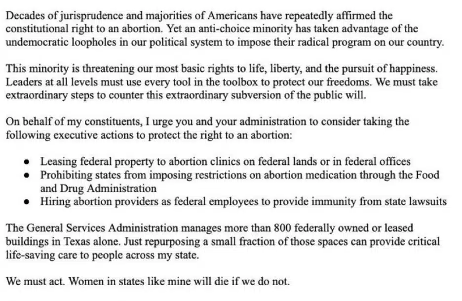 Texas Democrat candidate for the Senate, James Talarico, wrote a desperate letter to Joe Biden pleading with him to issue an executive order to create abortion clinics in federal buildings.