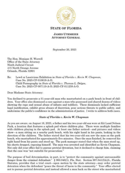 “While we had all of this evidence and an open and shut case, State Attorney Worrell decided charges did not need to be brought,” Uthmeier said. “She gave this guy a free walk in the park, and now other kids are in jeopardy of having a tragic incident happen to them.”