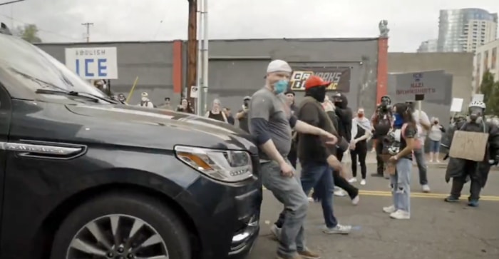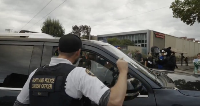 If you listen to the clip after the first screenshot, you will hear the liaison officer screaming at the woman to turn her car around as he protects Antifa. He threatened her with arrest instead of breaking up the riot in front of the ICE facility and the mobs of Antifa in surrounding areas.