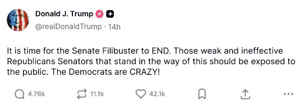 President Trump demanded that the Senate finally end the filibuster in a post on Truth Social last night. He wants weak and ineffective Republicans who stand in the way to be exposed.