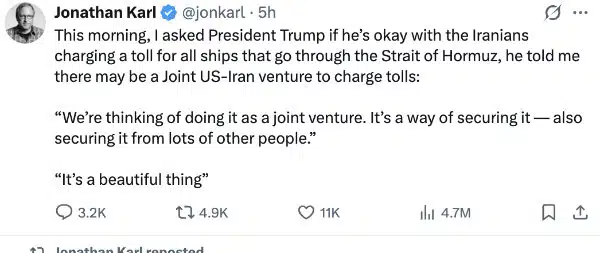 ABC News reporter Jonathan Karl asked President Trump about the prospect of Iran charging tolls for ships passing through the Strait of Hormuz.