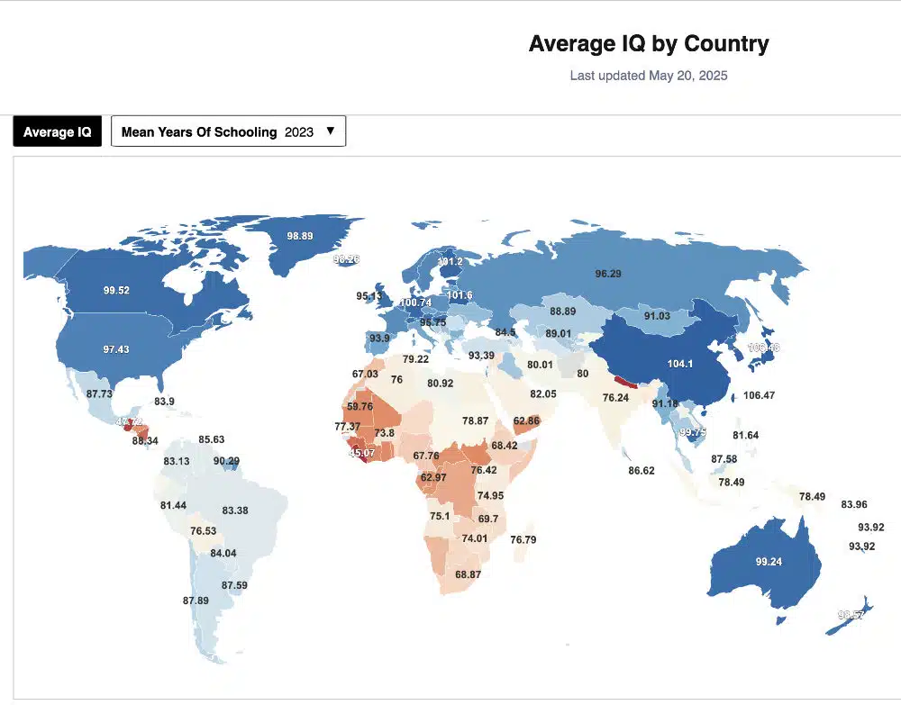 The map shows that the two highest average IQs are China (104) and Japan (106), both nations have zero or close to zero immigrants of certain colors.