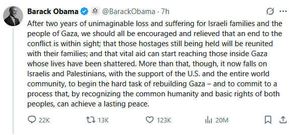 Obama put out an entire statement on the peace deal and didn’t mention Donald Trump.