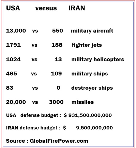 I was looking for that kind of information because some fools on facebook are saying the USA is being defeated by Iran ! Which is absurd Thank you M Dowling ! And for what this is worth, I went to GlobalFirePower.com and made a table from the numbers they provide, which I hope are accurate ( Missile number is an… Read more »