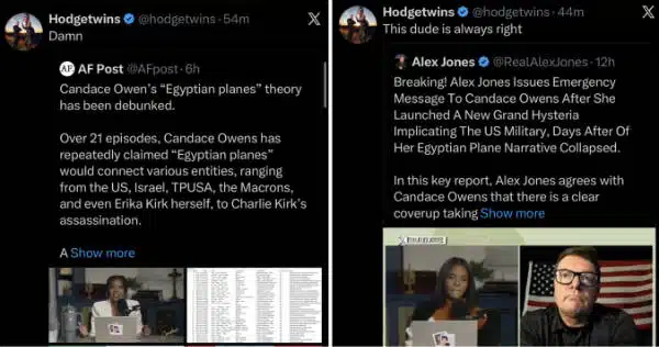 Candace’s loyal friend and admirer, Alex Jones, blew up that story. He warned her against some of her more [reckless] comments against Erika Kirk and the TPUSA staff.