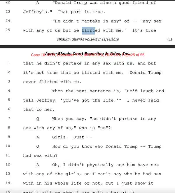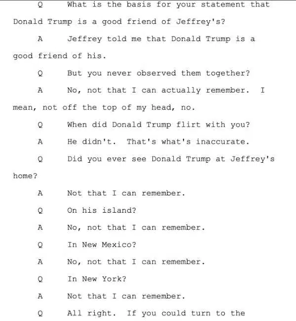 A prosecutor asked her about an article in which the reporter said Donald Trump flirted with her. In her own words: “Trump didn’t partake in any sex with us, and it’s not true that he flirted with me… I didn’t see him have sex with any of the girls. Trump was never in the presence of ‘other girls’.”