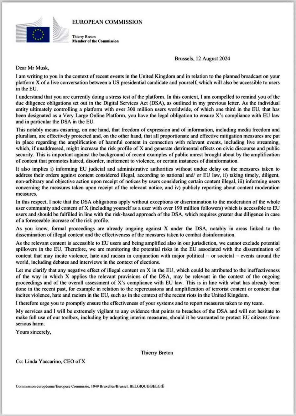 “I remember thinking last year that this was one of the most chilling letters I’d ever read. It treats freedom of speech as merely one factor to be weighed in the balance against “detrimental effects on civic discourse and public security.” And the letter was targeted specifically at a conversation on this very platform between @elonmusk, an American, and @realDonaldTrump, also an American, then running for the US Presidency.