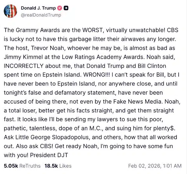 “The Grammy Awards are the WORST, virtually unwatchable!” President Trump wrote. “CBS is lucky not to have this garbage litter their airwaves any longer.”