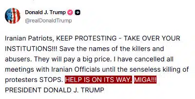 President Trump just responded to the Iranian protesters: “HELP IS ON ITS WAY! MIGA!!!”