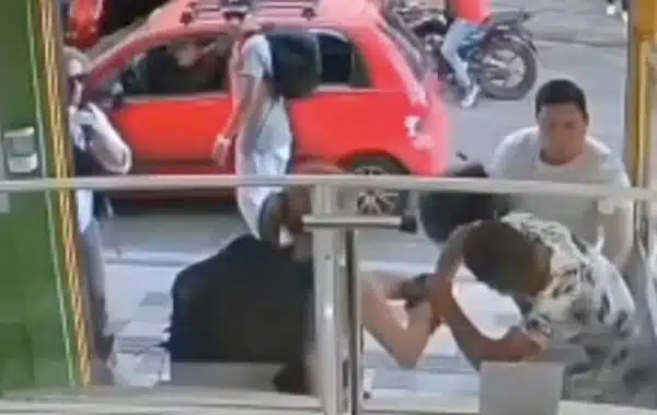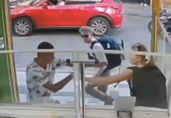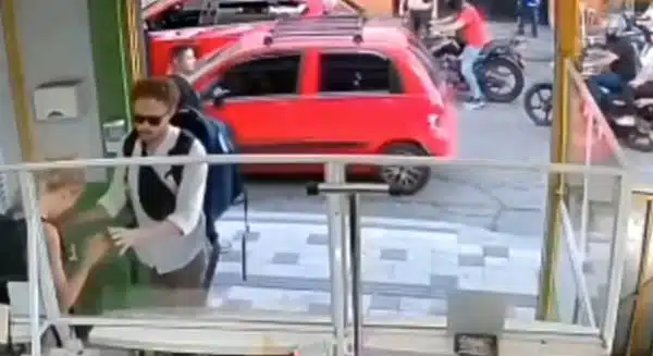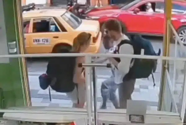 Two young backpackers chatted at the entrance of a bank or something like it in Colombia when a thug with a weapon was caught on security camera footage.