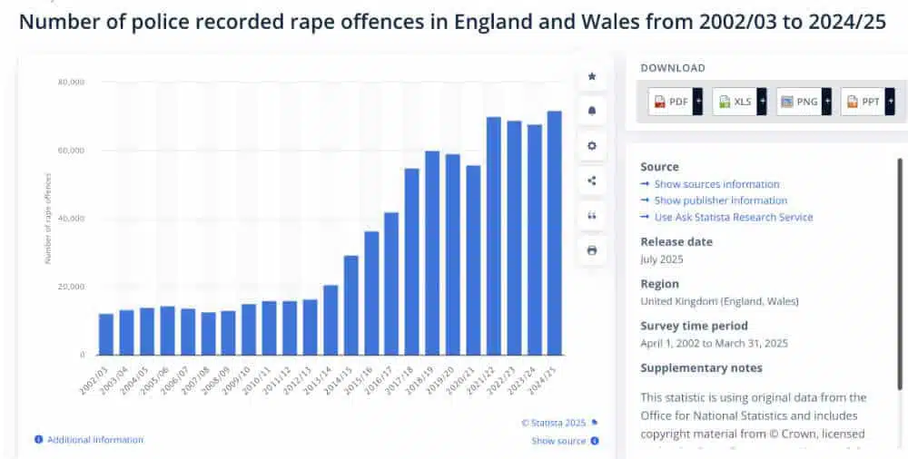 Additionally, only 2.7% of reported cases result in charges, indicating a persistent issue with underreporting and low conviction rates. The overall trend shows a significant rise in sexual offenses, with 55,685 recorded in 2020/21 and 71,667 in 2024/25.