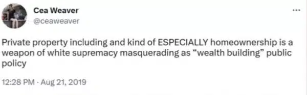 In other words, Cea Weaver says the city will transition private property to being a “collective good.” She says that especially white families, but people of color who own homes too, won’t own their homes.